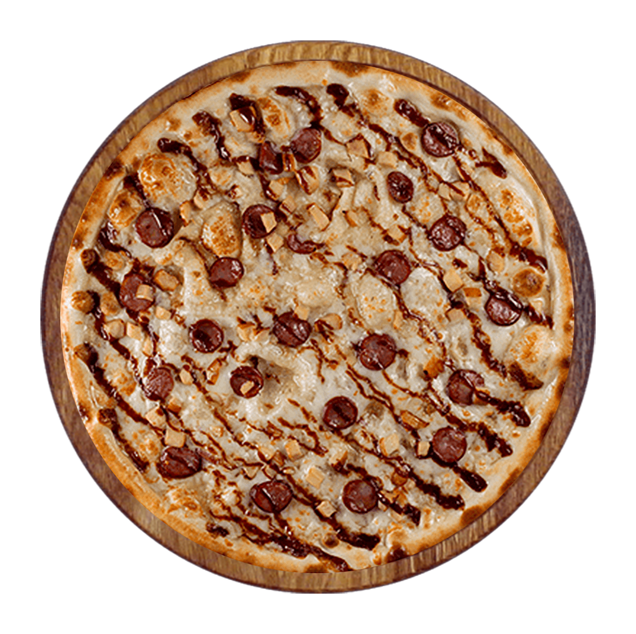 Sauce barbecue, mozzarella, viande hachée, poulet rôti, merguez.